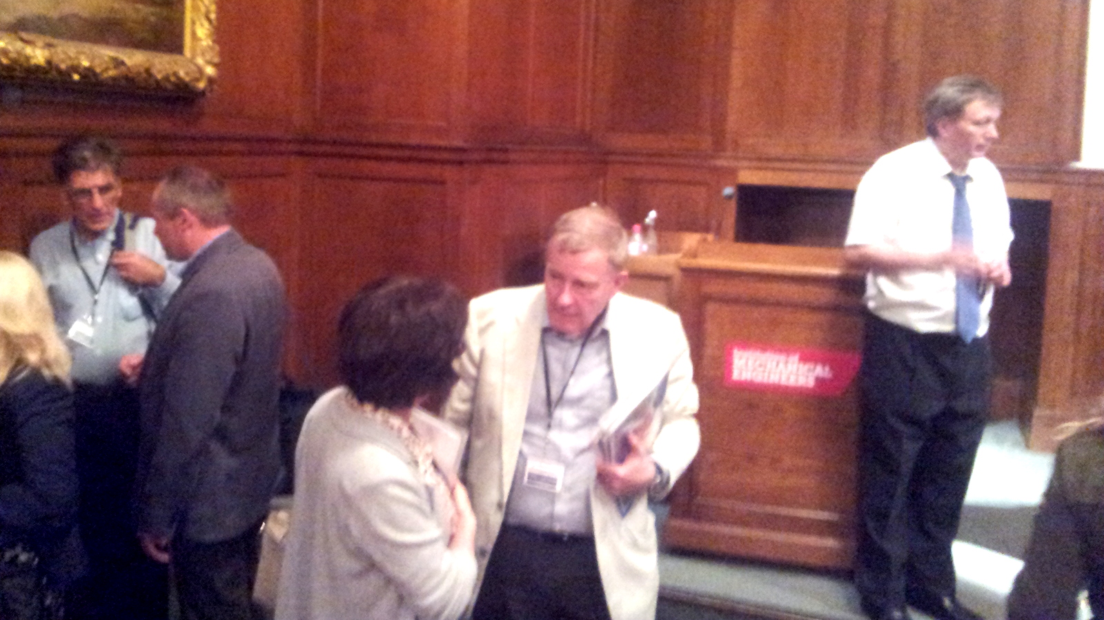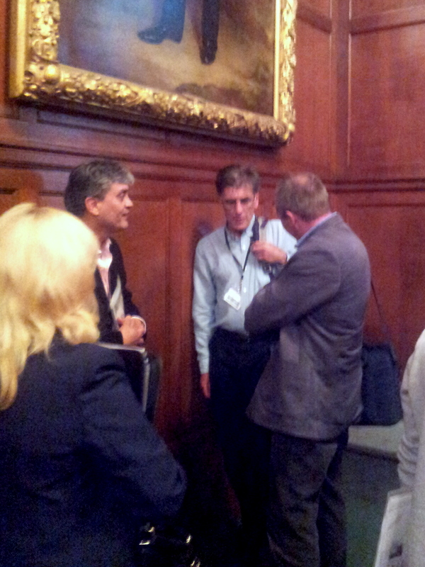 Jonathan Edwards (i blå skjorte) i samtale med Øystein Fluge (t.h.) og forsker Amolak Bansal på forskningskonferansen i London i mai 2013.